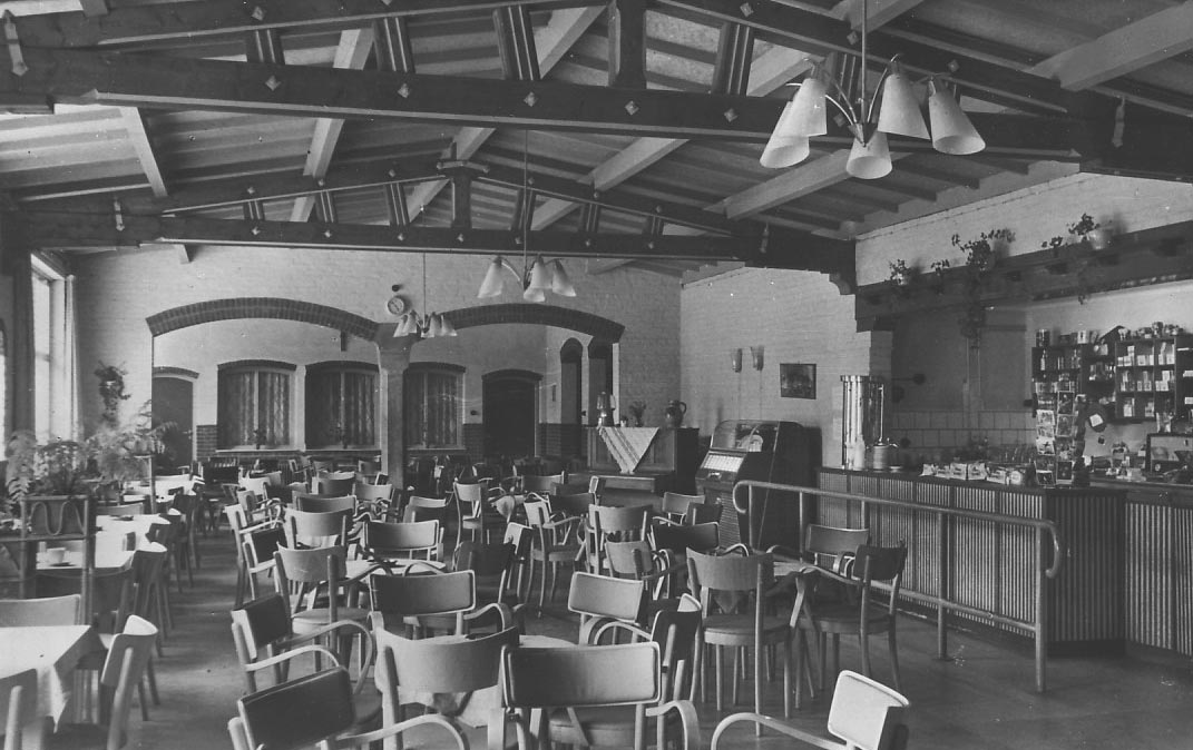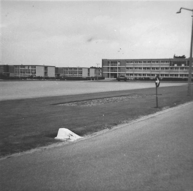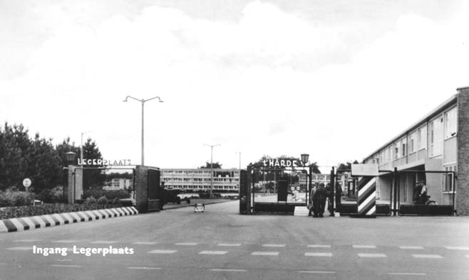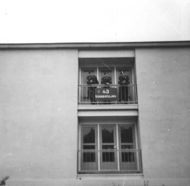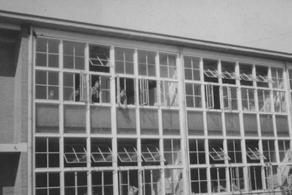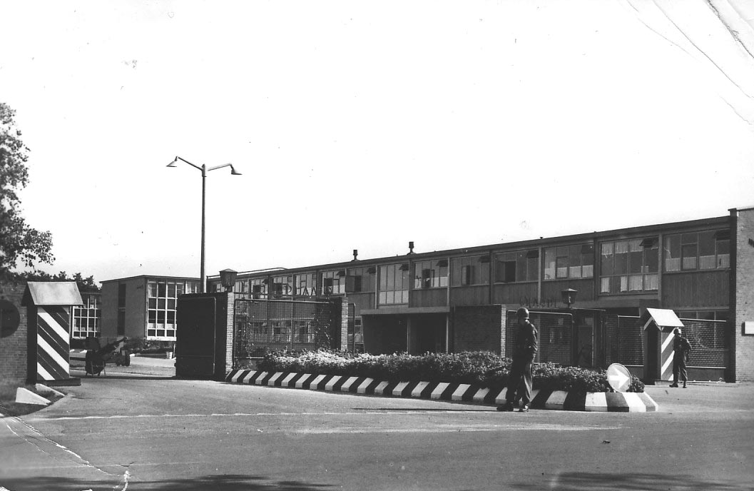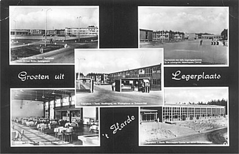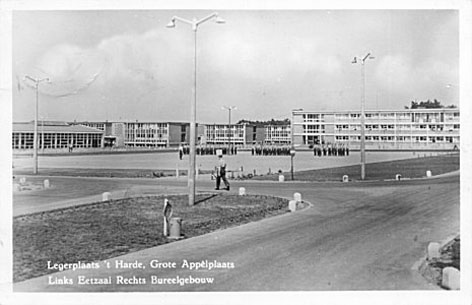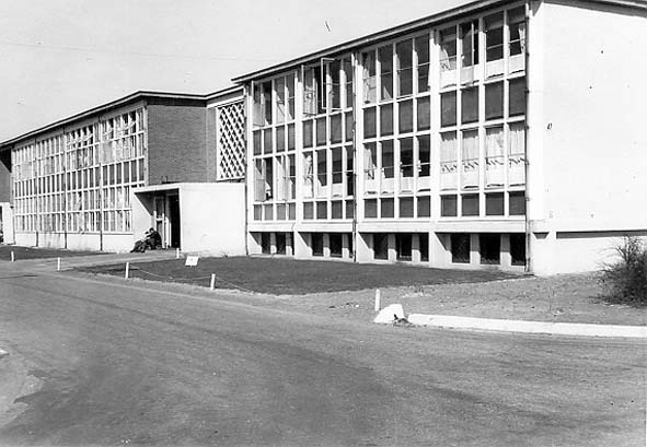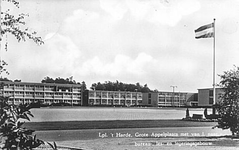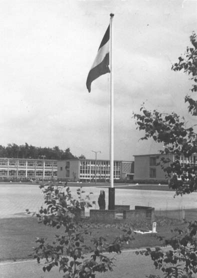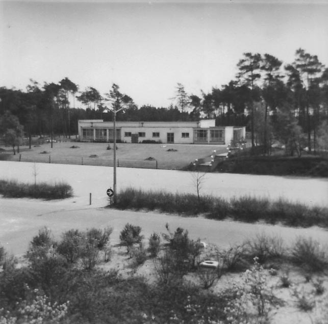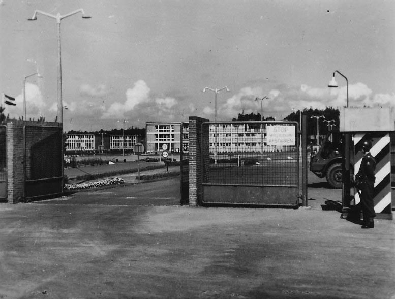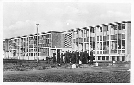 Gebouw 47 met vlnr: J. Bischoft Tulleker, C, Schreuder, G v. Stratum